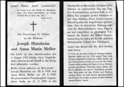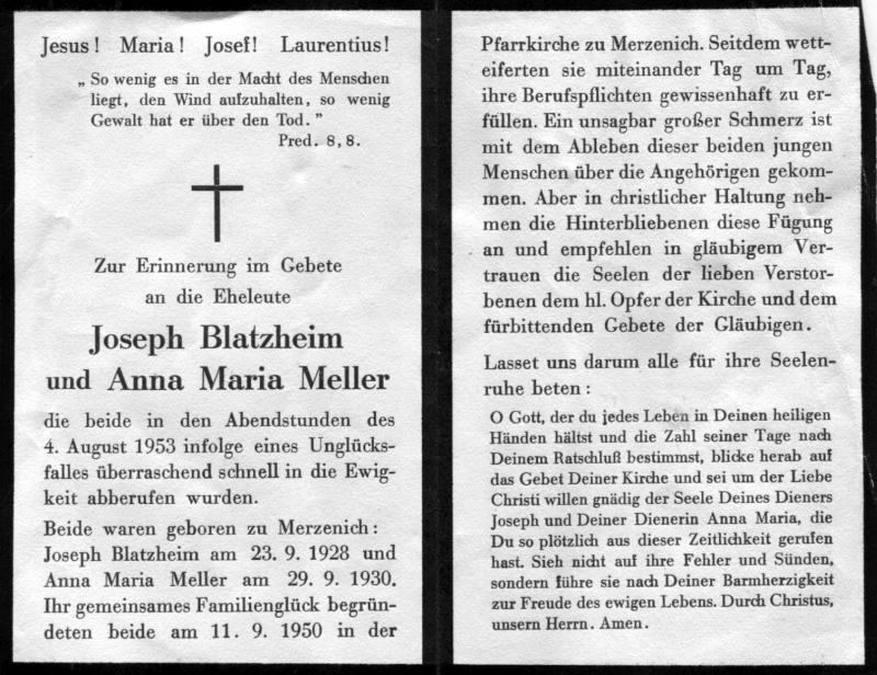 Tod durch Unglücksfall, zusammen mit seiner Frau Anna Maria geb. Meller; Heirat am 11.9.1950 in Blatzheim |