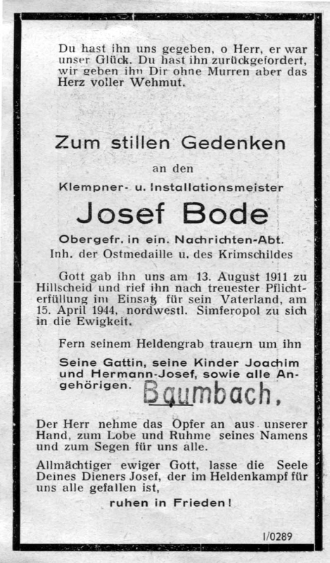 Gefallener 2. Weltkrieg; Klempner- u. Installationsmeister; verh., Kinder: Joachim, Hermann-Josef |