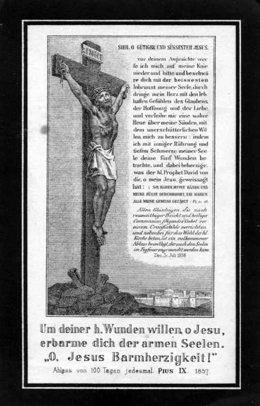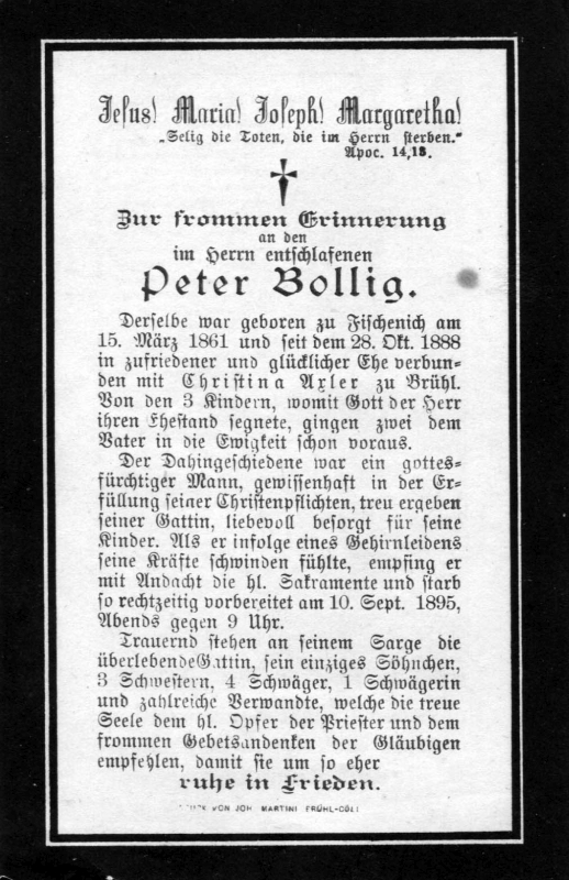 ∞ 28.10.1888 Christina Axler zu Brühl; 3 K., davon 2 †; Wohnort Brühl; Gehirnleiden; Druck in Brühl, Rhld. |