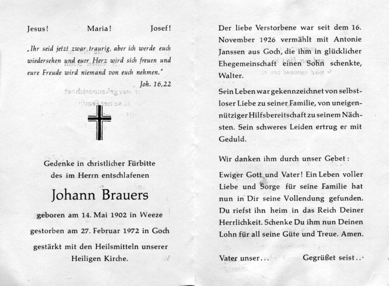 ∞ 16.11.1926 Antonie Janssen aus Goch; 1 Sohn (Walter); schweres Leiden |
