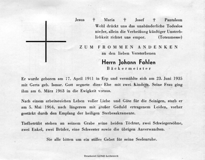 Bäckermeister; ∞ 23.6.1935 Gerta Ismar, † 6.3.1963; 2 K.; Druck in Lechenich |