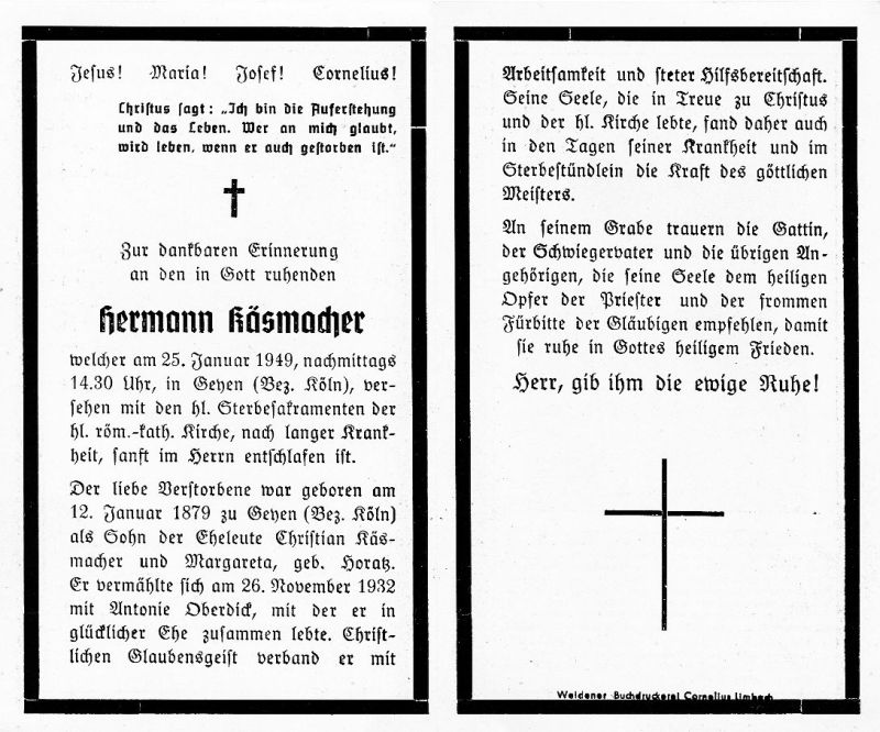 Eltern: Christian Käsmacher u. Margareta geb. Horatz; ∞ 26.11.1932 Antonie Oberdick |