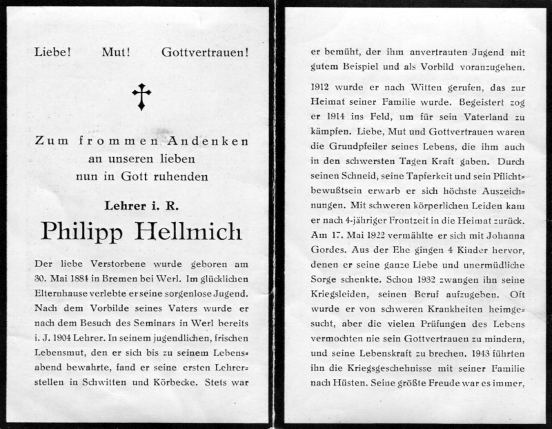 Wurde wie sein Vater Lehrer; Ausbildung: Seminar Werl; 1904 Lehrer, zunächst in Schwitten u. Körbecke; 1912 nach Witten, das zur Heimat seiner Familie wurde; 4 J. Soldat im 1. Weltkrieg, kehrte mit schweren körperl. Leiden zhurück; ∞ 17.5.1922 Johanna Gordes; 4 K.; wegen Kriegsleiden 1932 Aufgabe seines Berufs; 1943 wegen des Krieges mit Familie nach Hüsten; |