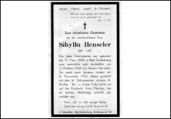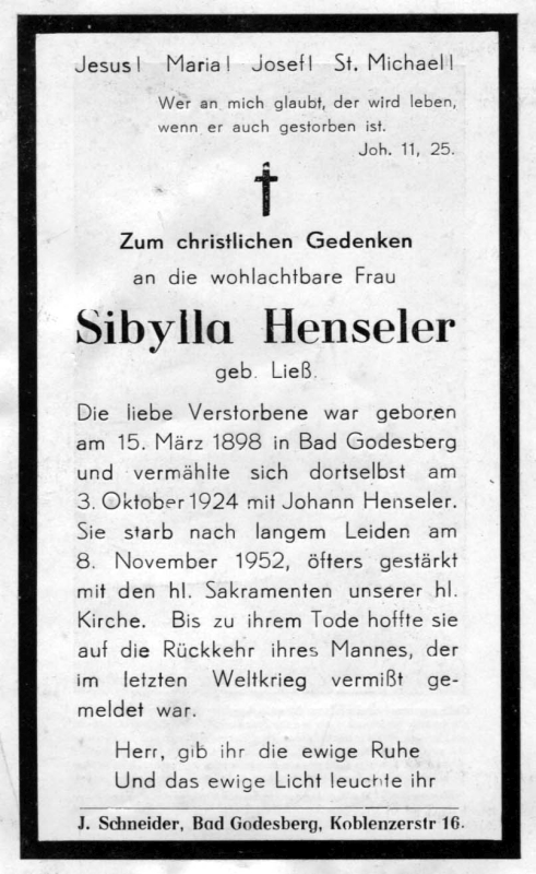 ∞ 3.10.1924 Johann Henseler, im 2. Weltkrieg vermisst; Druck in Bad Godesberg |