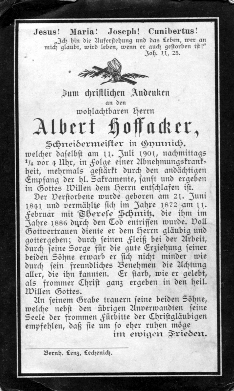 Schneidermeister in Gymnich; Abnehmungskrankheit; ∞ 11.2.1872 Therese Schmitz, † 1886; 2 Söhne |