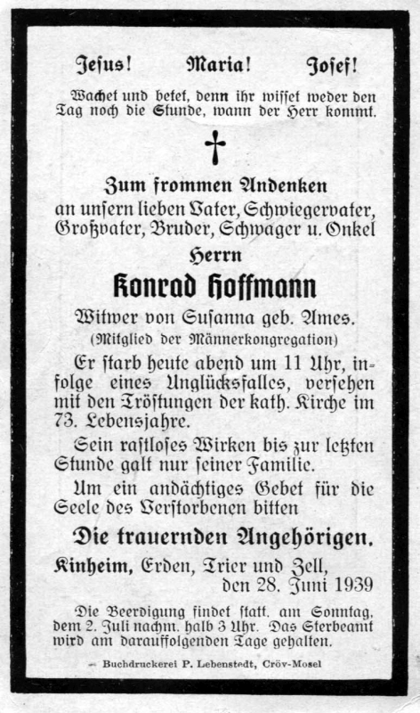 73 J.; Tod nach Unglücksfall; ∞ Susanna Ames, †; Mitgl. Männerkongregation; Wohnort: Kinheim |