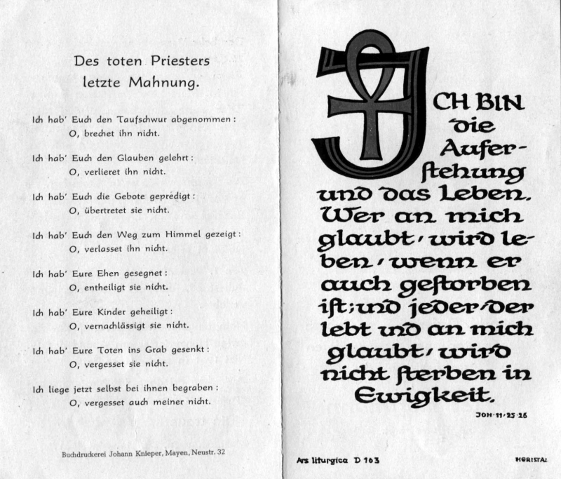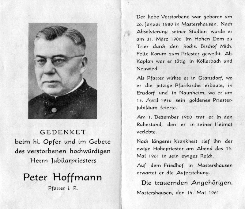 Priesterweihe Trier 31.3.1906; Kaplan in Köllerbach u. Neuwied; Pfarrer in Gransdorf, Ensdorf u. Naunheim; dort 1956 Goldenes Priesterjubiläum; 1.12.1960 Ruhestand, den er in seiner Heimat verbrachte |