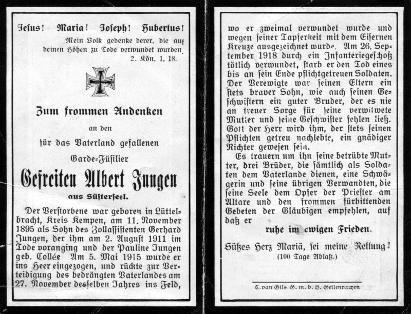 Gefallener 1. Weltkrieg; Eltern: Zollassistent Gerhard Jungen, † 2.8.1911, u. Pauline geb. Collée; Einberufung 5.5.1915, am 27.11. ins Feld; zweimal verwundet; Wohnort: Süsterseel; Druck in Geilenkirchen |