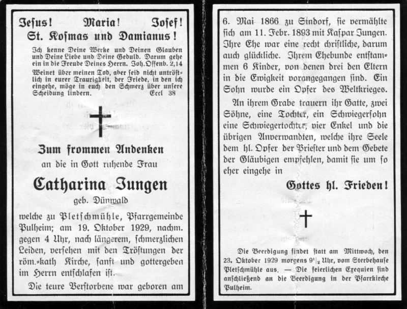 ∞ 11.2.1893 Kaspar Jungen; 6 K., davon 3 †; Exequien in Pulheim |