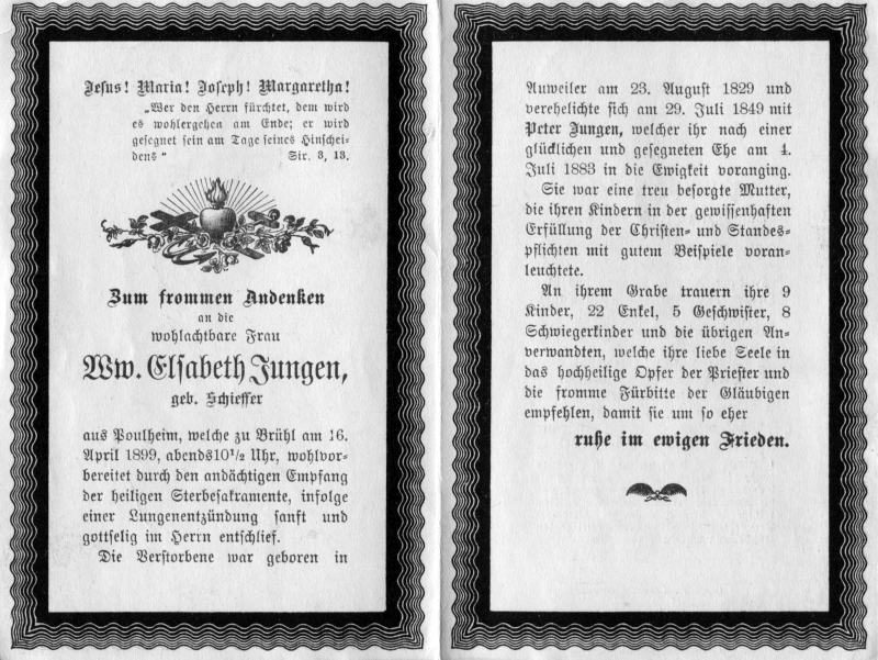 ∞ 29.7.1849 Peter Jungen;, † 4.7.1883; 9 überlebende Kinder; Wohnort; Brühl |