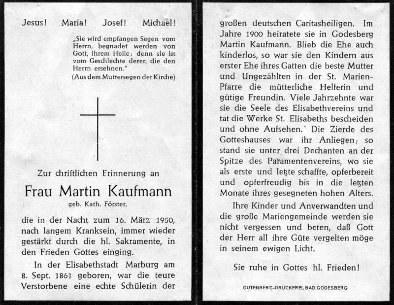 ∞ 1900 in Bad Godesberg Witwer Martin Kaufmann; kinderlos; nahm sich der Kinder ihres Mannes aus 1. Ehe an; führendes Mitgl. Elisabethverein; Druck in Bad Godesberg |