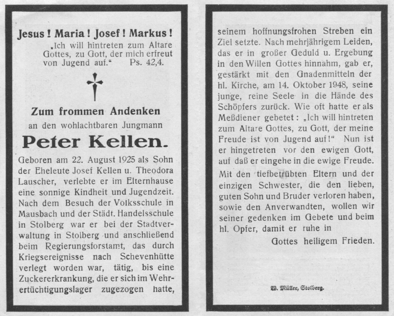 Volksschule in Mausbach; Handelsschule in Stolberg; bei Stadtverwaltung Stolberg u. dann Regierungsforstamt, verlegt nach Schevenhütte, tätig; Zuckererkrankung; Druck in Stolberg |