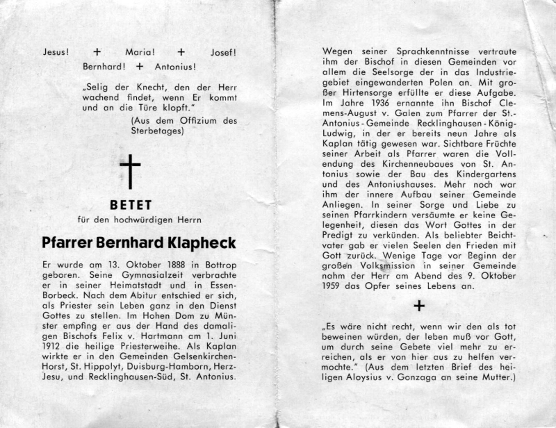 Priesterweihe Münster 1.6.1912; Kaplan in Gelsenkirchen-Horst, Duisburg-Hamborn, Recklinghausen-Süd; wegen poln. Sprachkenntnisse verantw. Für Seelsorge bei den eingbewanderten Polen; 1936 Pfarrer an St. Antonius in Recklinghausen-König-Ludwig (Recklinghausen-Süd) |