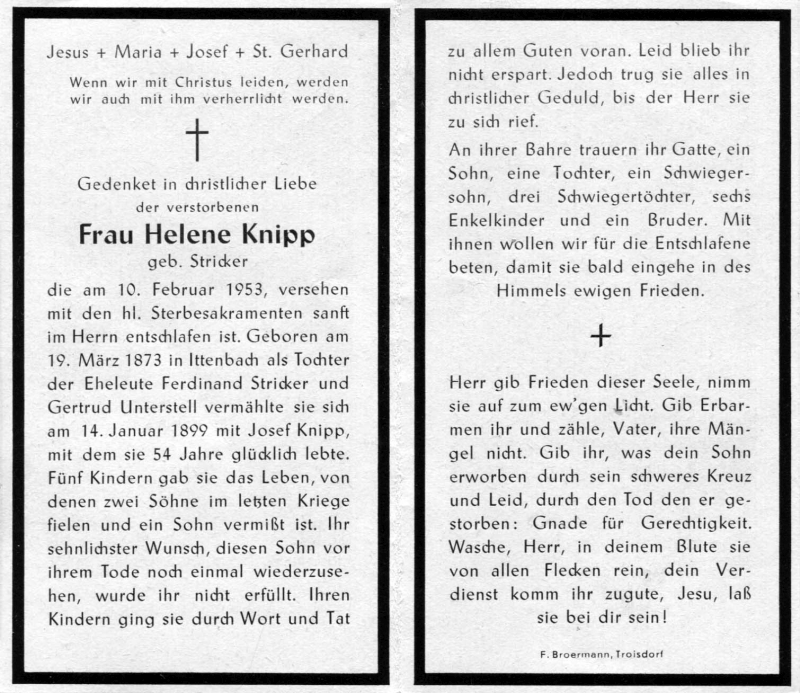 Eltern: Ferdinand Stricker u. Gertrud geb. Unterstell; ∞ 14.1.1899 Josef Knipp; 5 K., davon 2 Söhne im 2. Weltkrieg gefallen u. 1 Sohn vermisst; Druck in Troisdorf |