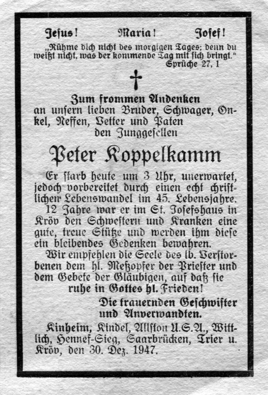 45 J.; Junggeselle; 12 J. im St.-Josefshaus in Kröv den Schwestern u. Kranken eine Stütze; Wohnort der Familie:Kinheim |