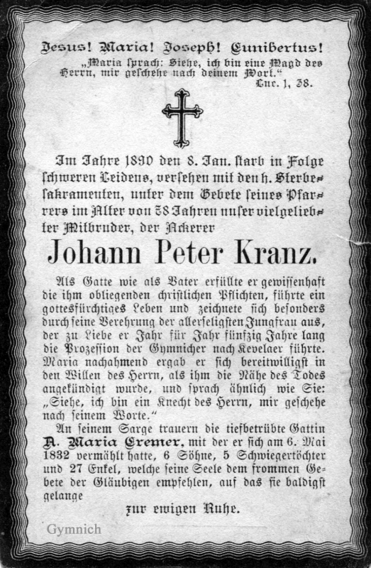 78 J.; Ackerer; führte 50 J. lang die Prozession der Gymnicher nach Kevelaer; ∞ 6.5.1832 Anna Maria Cremer; 6 überlebende Söhne |