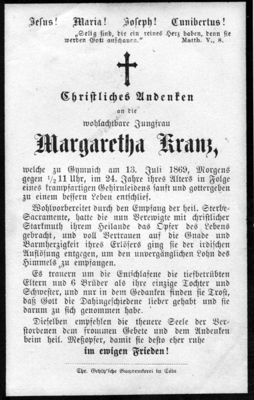 24 J.; Jungfrau; 6 Brüder; Eltern: Johann Peter Kranz u. Anna Masria geb. Cremer |