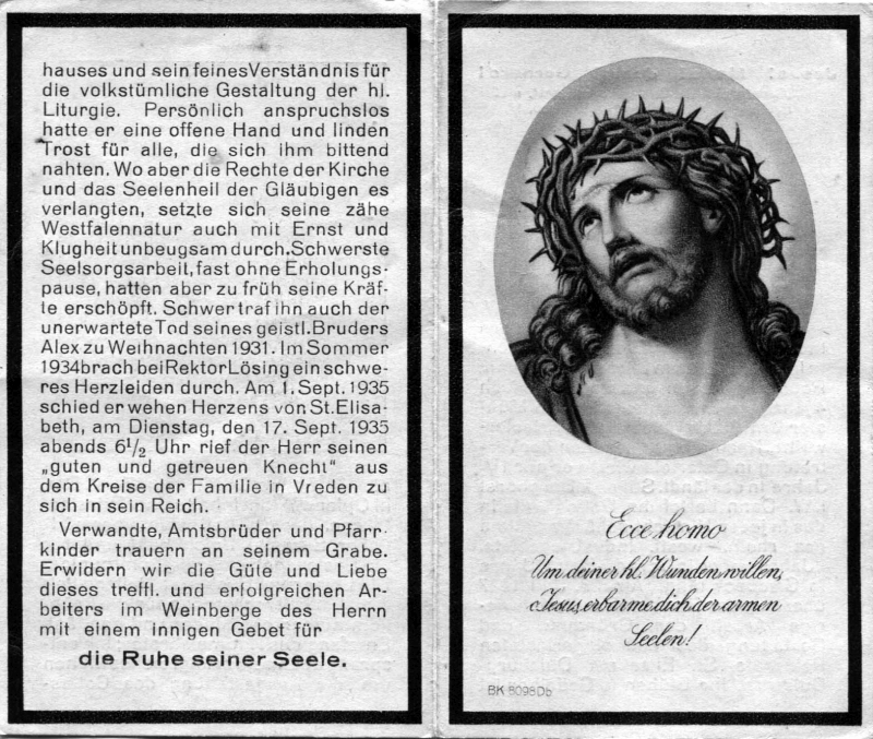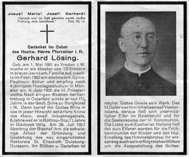 Priesterweihe Münster 9.6.1906; einige Wochen Vertretung in Osterfeld, danach 1 1/2 J. Borghorst i. Westf.; 8 J. in Bottrop-Boy, 11 J. in Gladbeck; 28.7.1927 Berufung zur Gründung des neuen Rektorats St. Elisabeth in Duisburg-Duissern; Tod seines geistl. Bruders Alex Weihn. 1931; seit 1934 Herzleiden; 1.9.1935 Ruhestand |
