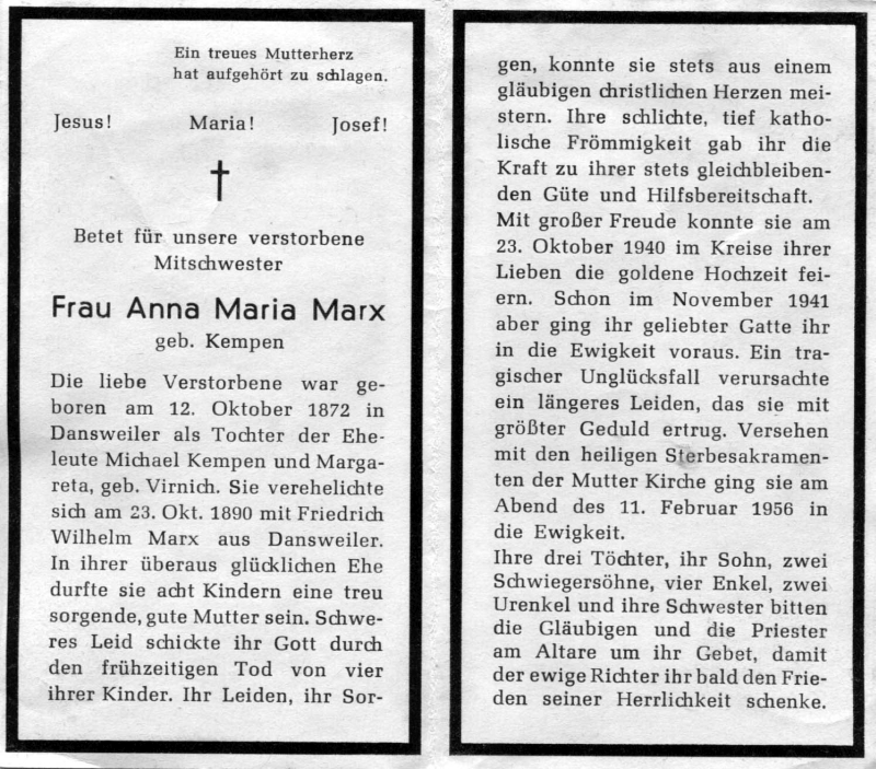 Eltern: Michael Kempen u. Margareta geb. Virnich; ∞ 23.10.1890 Friedrich Wilhelm Marx aus Dansweiler, † Nov. 1941; 8 K., davon 4 †; Goldhochzeit 1940; nach Unfall längeres Leiden |