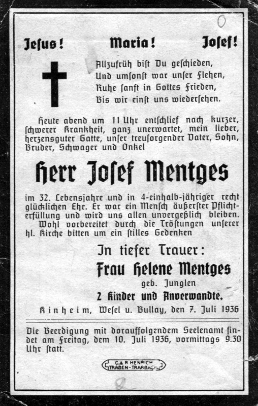 32 J.; ∞ ca. 1932 Helene Junglen; 2 K.; Wohnort: Kinheim |