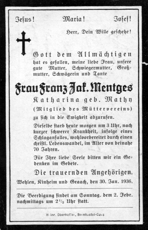 Schlaganfall; ∞ Franz Jakob Mentges; Mitgl. Mütterverein; Wohnort: Wehlen |