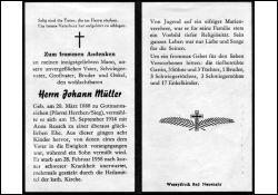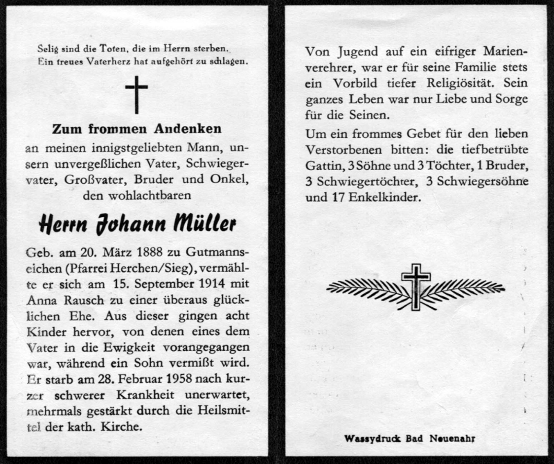 ∞ 15.9.1914 Anna Rausch; 8 K., davon 1 †, 1 Sohn im 2. Weltkrieg vermisst; Druck in Neuenahr |
