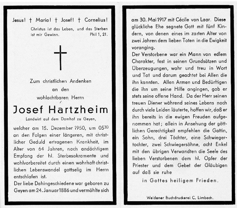 Landwirt auf dem Domhof zu Geyen; ∞ 30.5.1917 Cécile van Laar; 5 K., davon 1 mit 2 J. † |