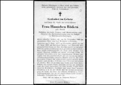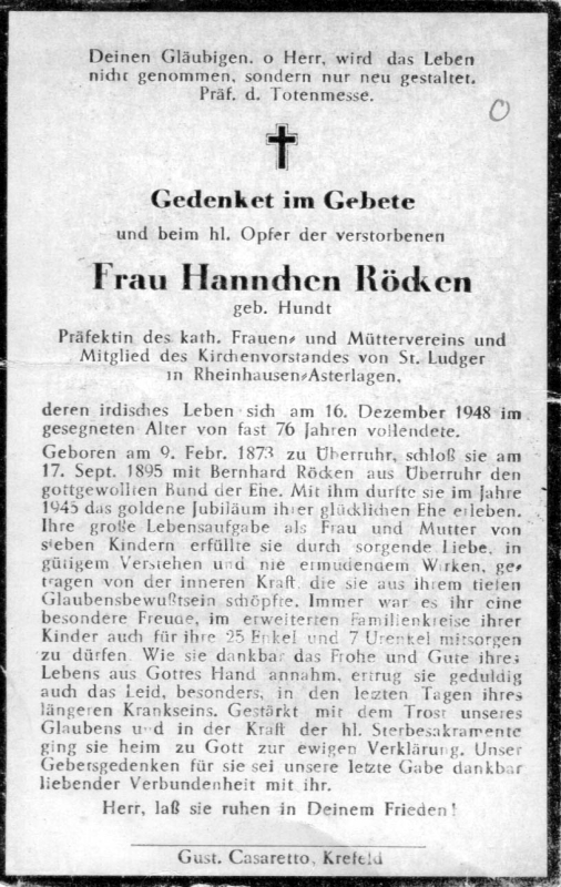Präf. D. kath. Frauen- u. Müttervereins; Mitgl. Kirchenvorstand von St. Ludger in Rheinhausen-Asterlagen; ∞ 17.9.1895 Bernhard Röcken aus Überruhr; 1945 Goldhochzeit; 7 K. |