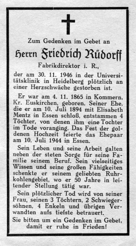 Fabrikdirektor i. R.; ∞ 10.7.1894 Elisabeth Mentz in Essen; 4 Töchter, davon 1 †; Goldhochzeit 10.7.1944 in Essen; im Ruhkolengebiet 50 J. in leitender Stellung tätig |