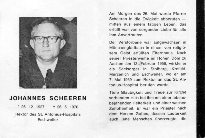 Priesterweihe Aachen 13.2.1956; wirkte als Seelsorger in Stolberg, Krefeld, Merzenich u. Eschweiler; dort am 7.5.1969 zum Rektor im St.-Antonius-Hospital berufen |