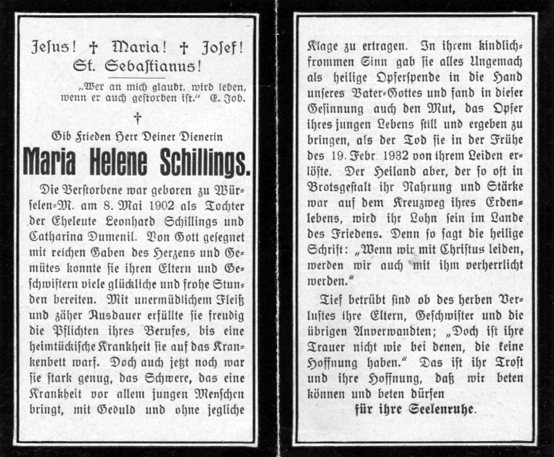 Eltern: Leonhard Schillings u. Catharina geb. Dumenil; heimtückische Krankheit |