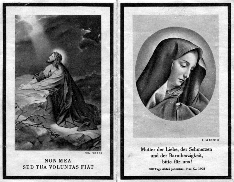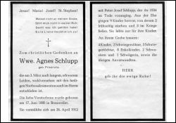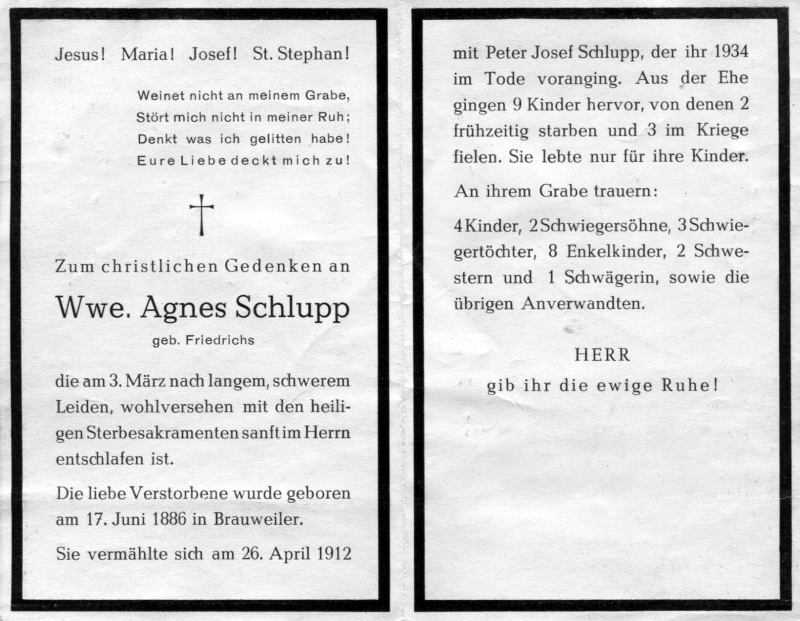 Langes, schweres Leiden; ∞ 26.4.1912 Peter Josef Schlupp, † 1934; 9 K., davon 2 früh n†; 3 Söhne im 2. Weltkrieg gefallen |