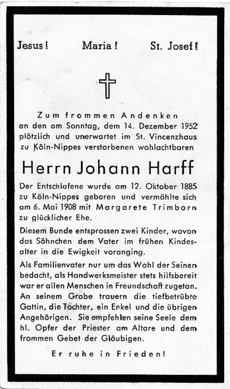 ∞ 6.5.1908 Margarete Trimborn; 2 K., davon 1 früh †; Handwerksmeister |