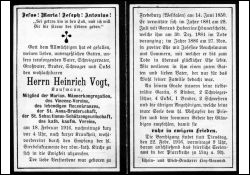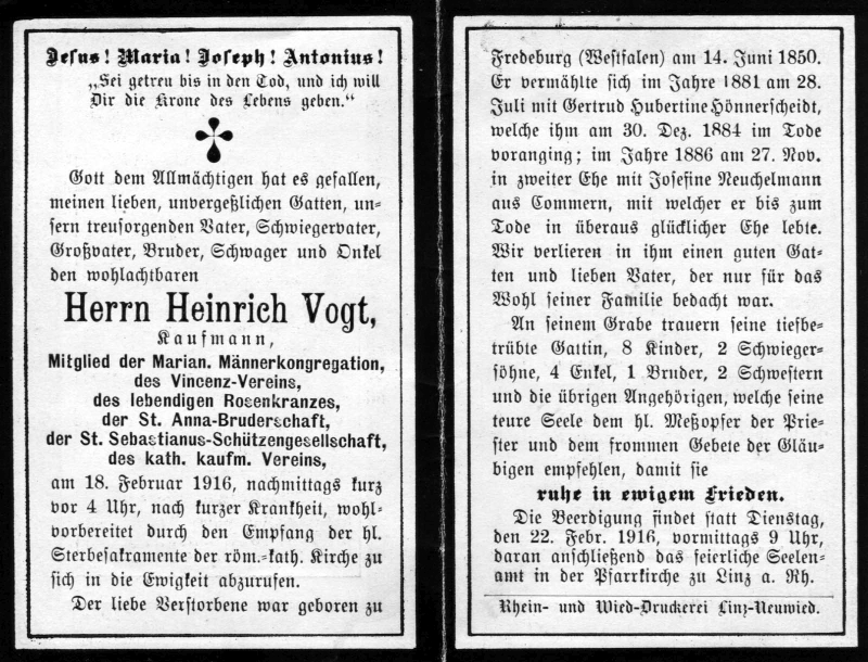 Kaufmann; Mitgl. Marian. Männerkomgregation, Vincenz-Verein, Lebendiger Rosenkranz, St.-Sebastianus-Schützenbruderschaft, kath. kaufm. Verein; ∞ 28.7.1881 Gertrud Hubertine Hönnerscheidt, † 30.12.1884; ∞ 27.11.1886 Josefine Neuchelmann aus Kommern; 8 überlebende Kinder; Wohnort Linz a. Rh. |