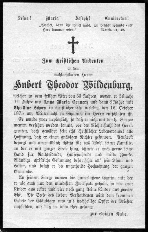 53 J.; 1. Ehe mit Anna Maria Connertz, 11 H.; 2. Ehe mit Christine Schorn, 8 J.; überlebende Kinder: 2 aus 1. Ehe, 4. aus 2. Ehe |