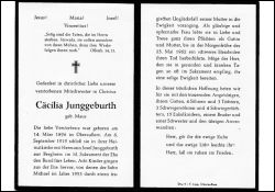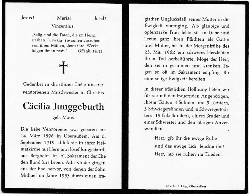 ∞ 6.9.1919 Hermann Josef Junggeburth aus Bergheim; 8 K.; Sohn Michael † 1953 durch trag. Unglücksfall |