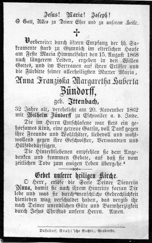 32 J.; ∞ 20.11.1862 Wilhelm Zündorff zu Eschweiler a. d. Inde |