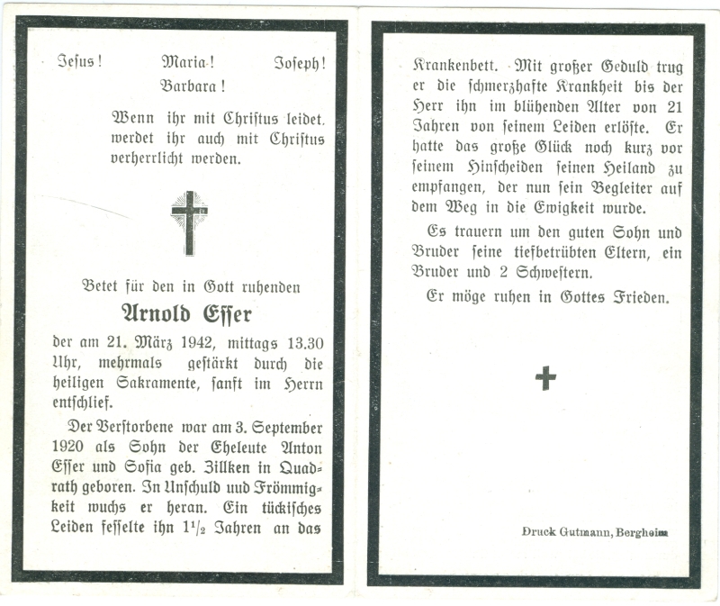 Eltern: Anton Esser u. Sofia geb. Zillken; seit 1 1/2 J. ans Krankenbett gefesselt; schmerzhafte Krankheit; † mit 21 J.; Druck in Bergheim/Erft |