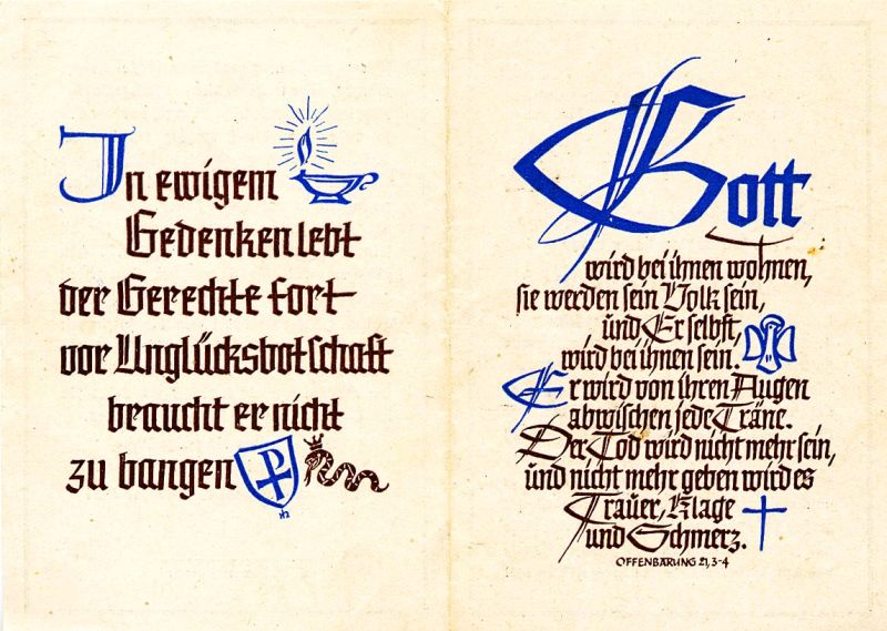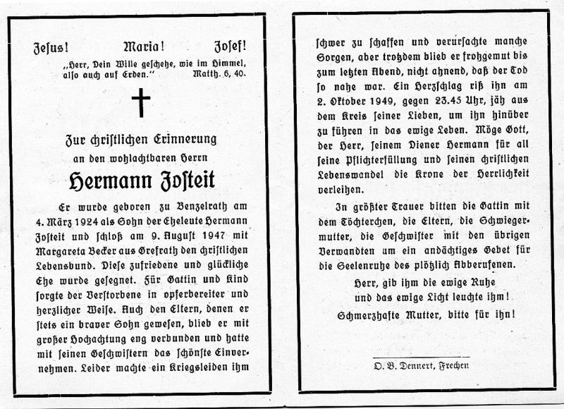 ∞ 9.8.1947 Margareta Becker aus Grefrath; 1 K.; Kriegsleiden (2. Weltkrieg) machte ihm schwer zu schaffen; Tod durch Herzschlag (Druck in Frechen) |