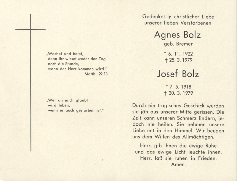 Tod durch tragisches Geschick; ∞ Agnes Bremer, † 25.3.1979 |
