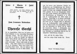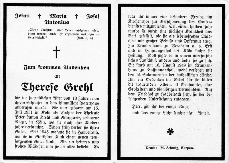 18 J.; Eltern: Peter Anton Grehl u. Marharete geb. Röger; seit 1945 in Habbelrath wohnhaft, wo sie in Matthias Kuck einen neuen treusorgenden Vater fand; seit halbem J. tückische Krankheit; 6 Geschwister |