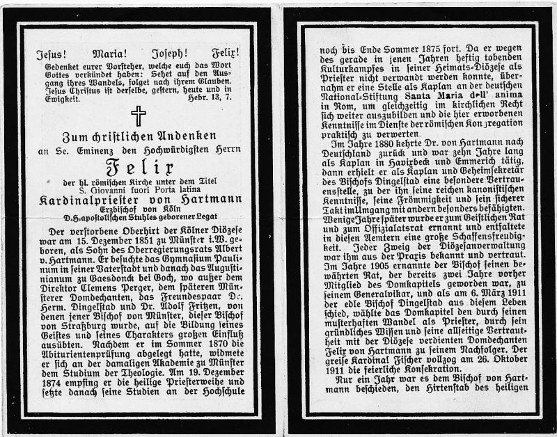 Kaplan in Rom, Havixbeck, Emmerich, Domdechant und Bischof in Münster; 1912 Erzbischof von Köln, Kardinal |