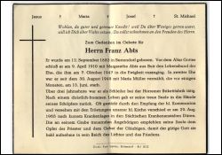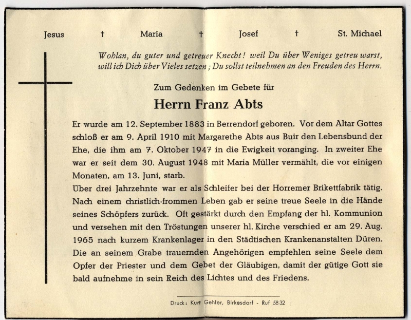 ∞ 9.4.1910 Margarethe Sieburg aus Buir, † 7.10.1947; ∞ 30.8.1948 Maria Müller, † 13.6.1965; über 30 J. Schleifer b. Horremer Brikettfabrik |