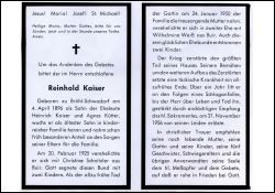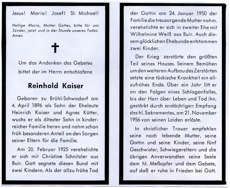 Schlaganfall; Eltern: Heinrich Kaiser u. Agnes geb. Kütter; ∞ 20.2.1925 Christine Schnitzler aus Buir, † 24.1.1950; 2 K.; ∞ Wilhelmine Weiß aus Buir; 2 K.; Haus im Krieg größtenteils zerstört; |