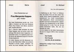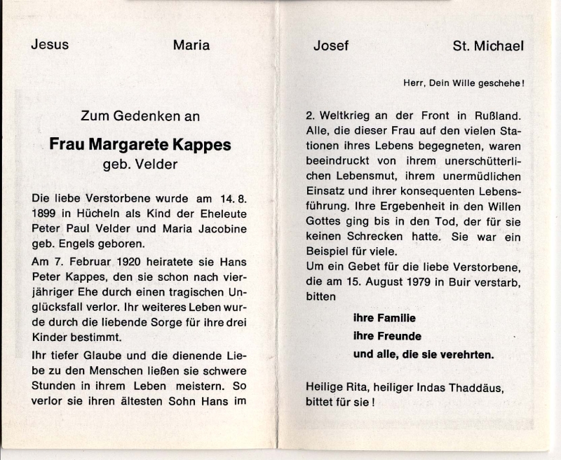 Eltern: Peter Paul Velder u. Maria Jacobine geb. Engels; ∞ 7.2.1920 Peter Kappes, nach 4 J. durch Unglücksfall †; 3 K., davon älterster Sohn im 2. Weltkrieg in Russland gefallen; |