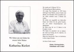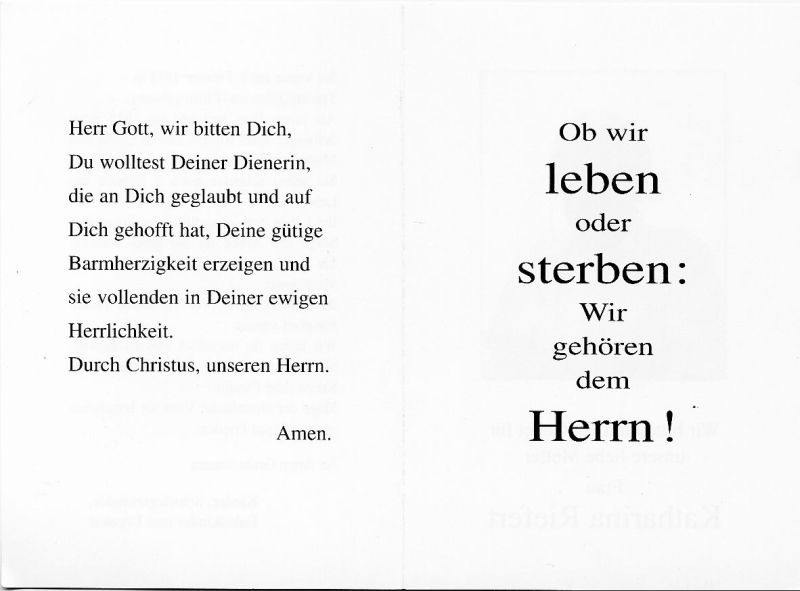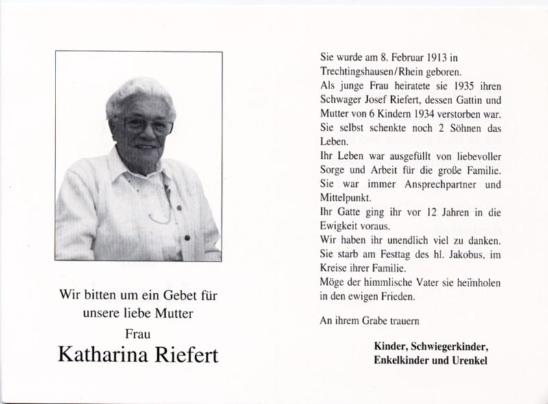 ∞ 1935 ihren Schwager Josef Riefert, dessen Gattin u. Mutter von 6 K. †; 2 Söhne; Gatte vor 12 J. † |