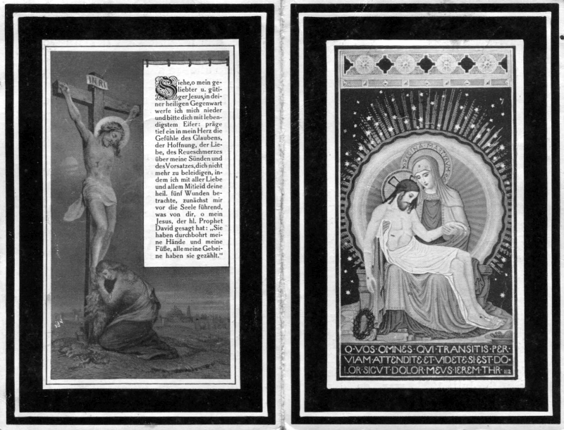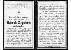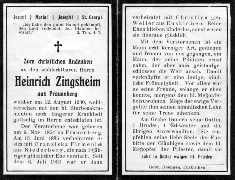 Wohnort: Frauenberg; ∞ 13.6.1885 Franziska Firmenich aus Niederberg, nach 19 J. Ehe †; ∞ 6.7.1906 Christina Weiler aus Euskirchen; beide Ehen kinderlos; Druck in Euskirchen |