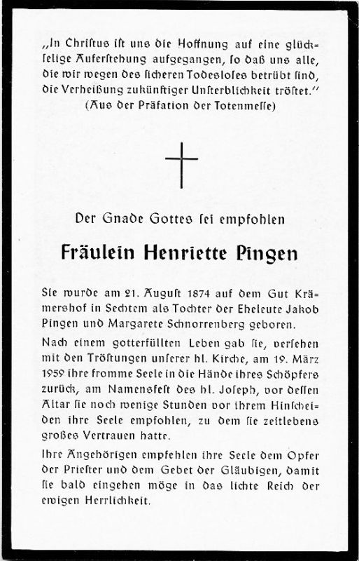 Fräulein; Eltern: Jakob Pingen u. Margarete geb. Schnorrenberg |