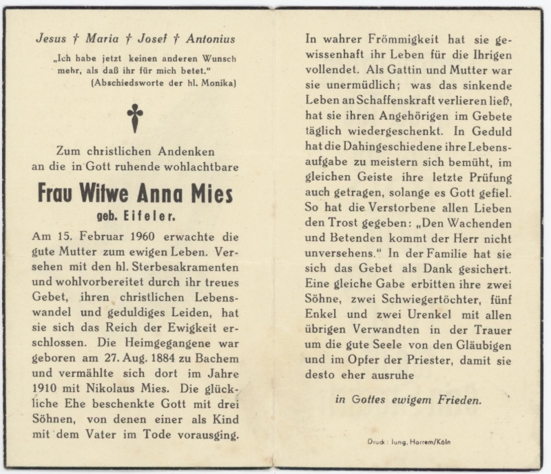 ∞ in Bachem 1910 Nikolaus Mies; 3 Söhne, davon 1 früh †; Druck in Horrem |