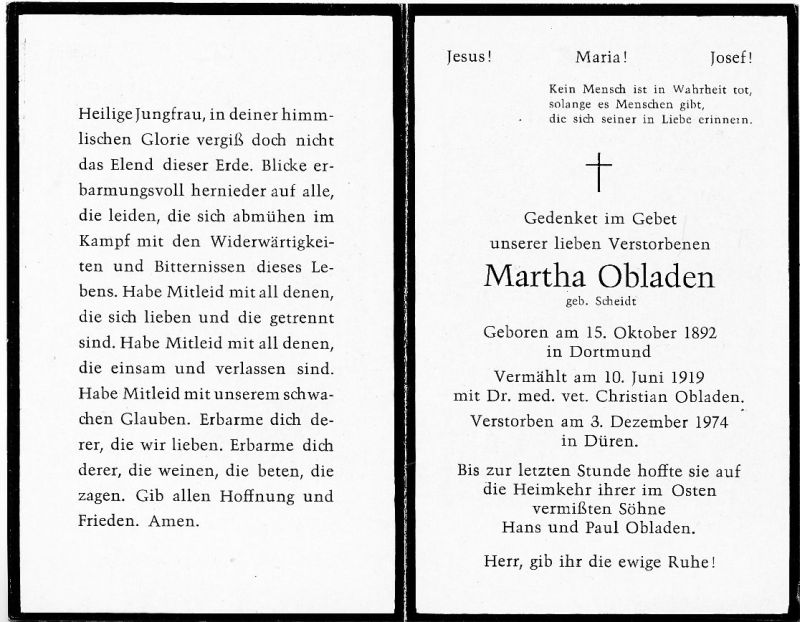 ∞ 10.6.1919 Dr. med. vet. Christian Obladen; Söhne Hans u. Paul im Osten vermißt (2. Weltkrieg) |